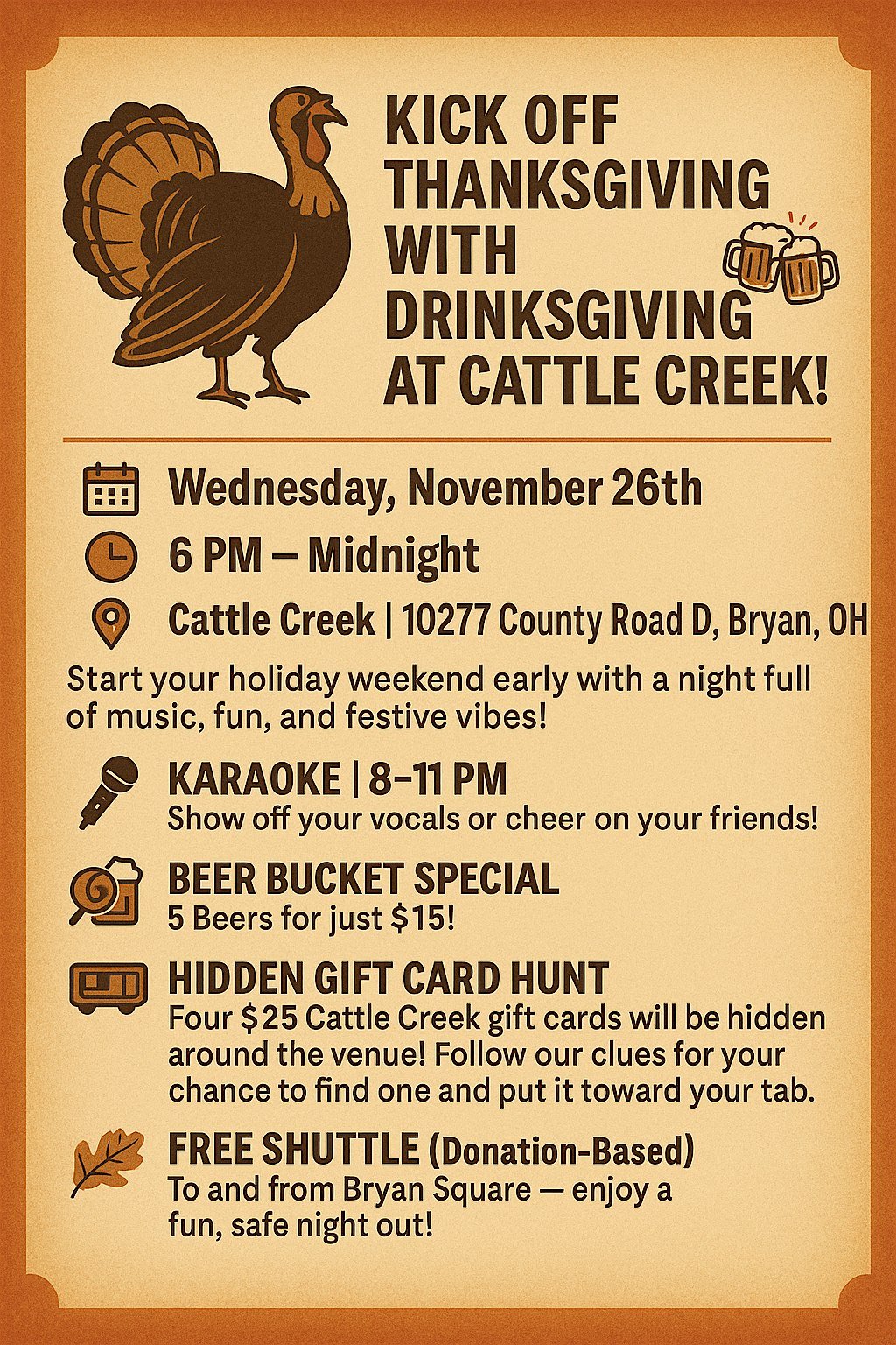 10277 Co Rd D 10277 County Road D, Bryan, OH, United StatesGet ready to test your knowledge and have a blast at Cattle Creek Trivia - it's going to be a wild ride!🧠🤠 Cattle Creek Trivia Night!Every Thursday, 7pm at Cattle Creek – 10277 CR D, Bryan, Ohio.Bring your team, enjoy a delicious dinner, grab a drink, and put your brain to the test for a […]